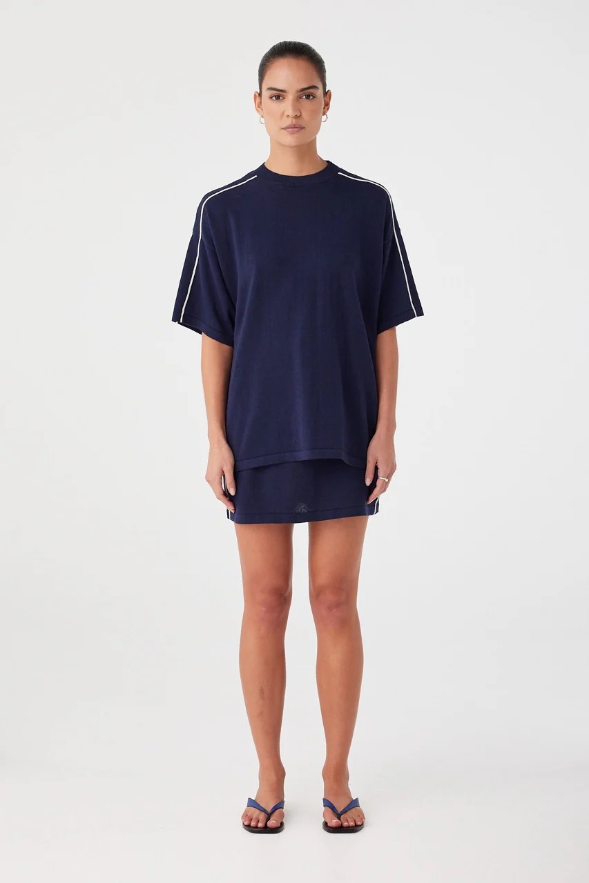 An oversized tee in a breathable linen–cotton knit with contrast stripe detail. Designed with dropped shoulders and a relaxed silhouette for elevated ease.