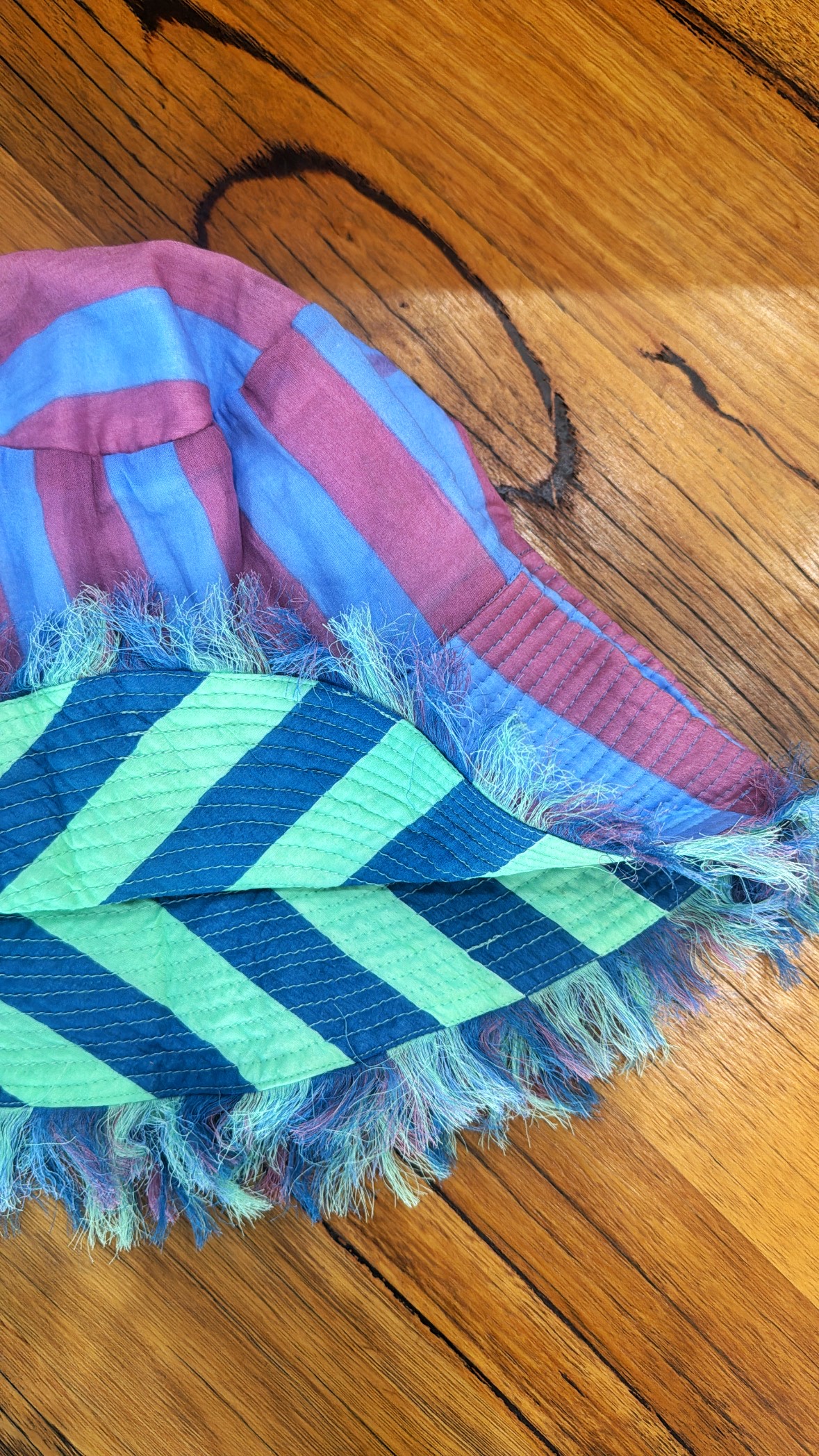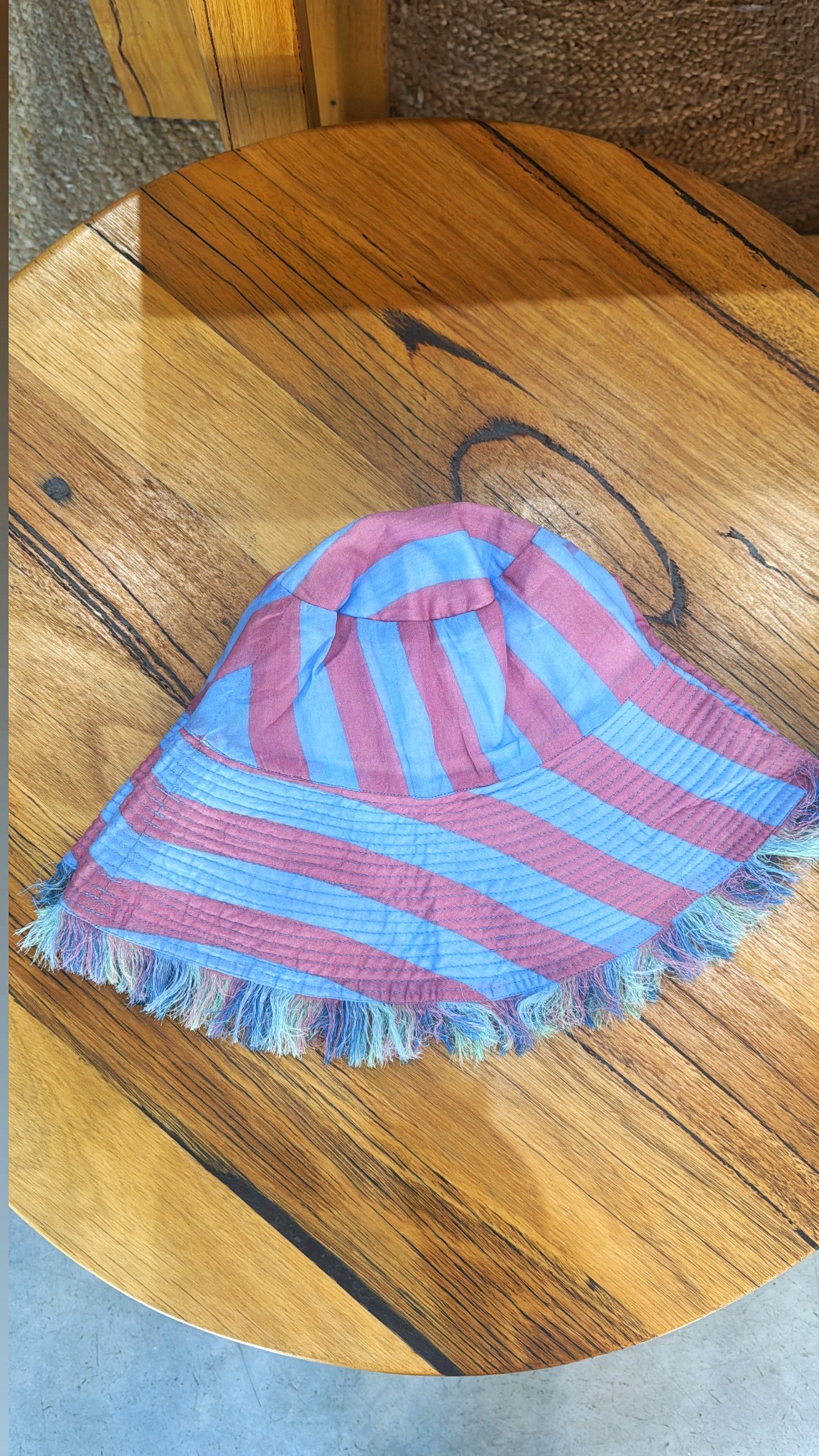 The new Fray Cotton Bucket Hat from Boom Shankar boasts fun bold stripe print: Bright orange and sky blue on one side; bright green and peach on the other. Made from 100% cotton and machine-washable makes it an easy choice for Summer
