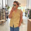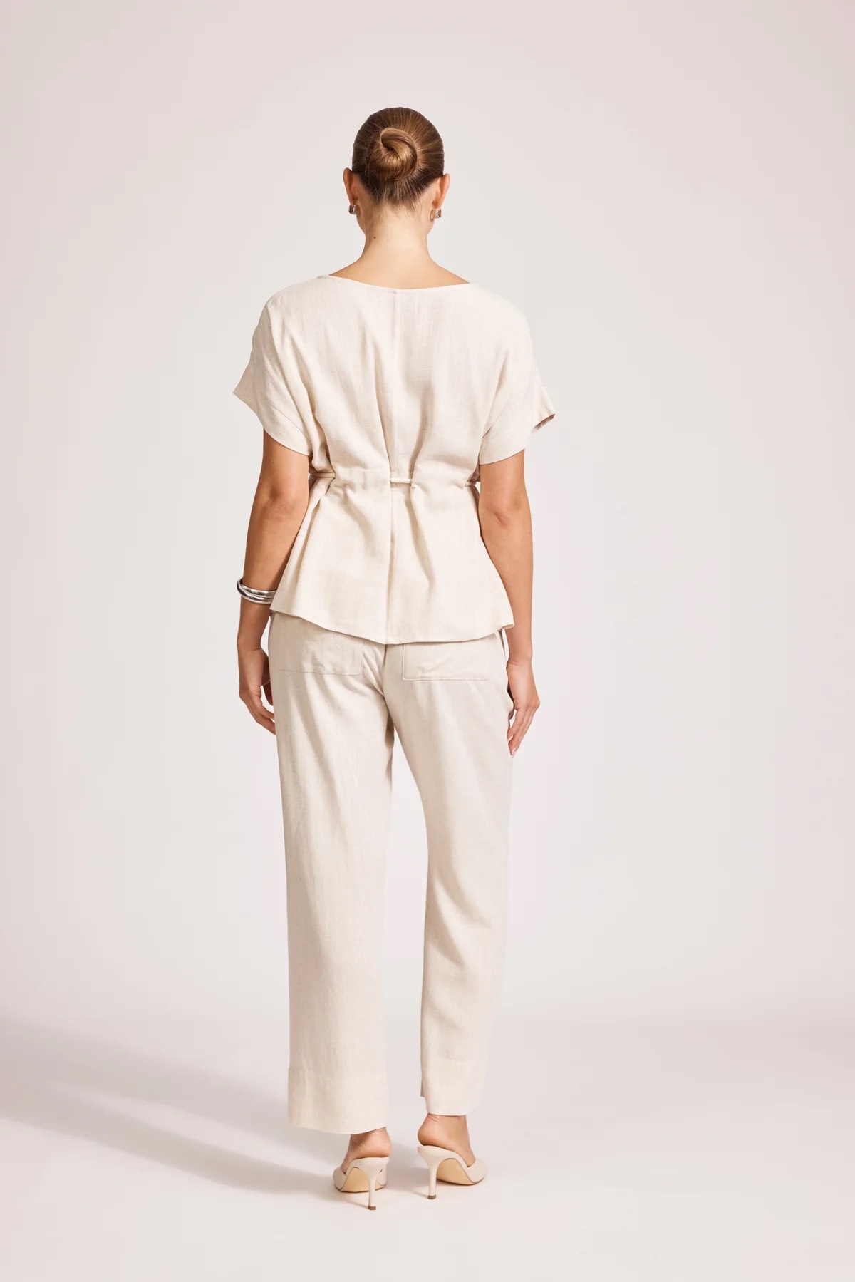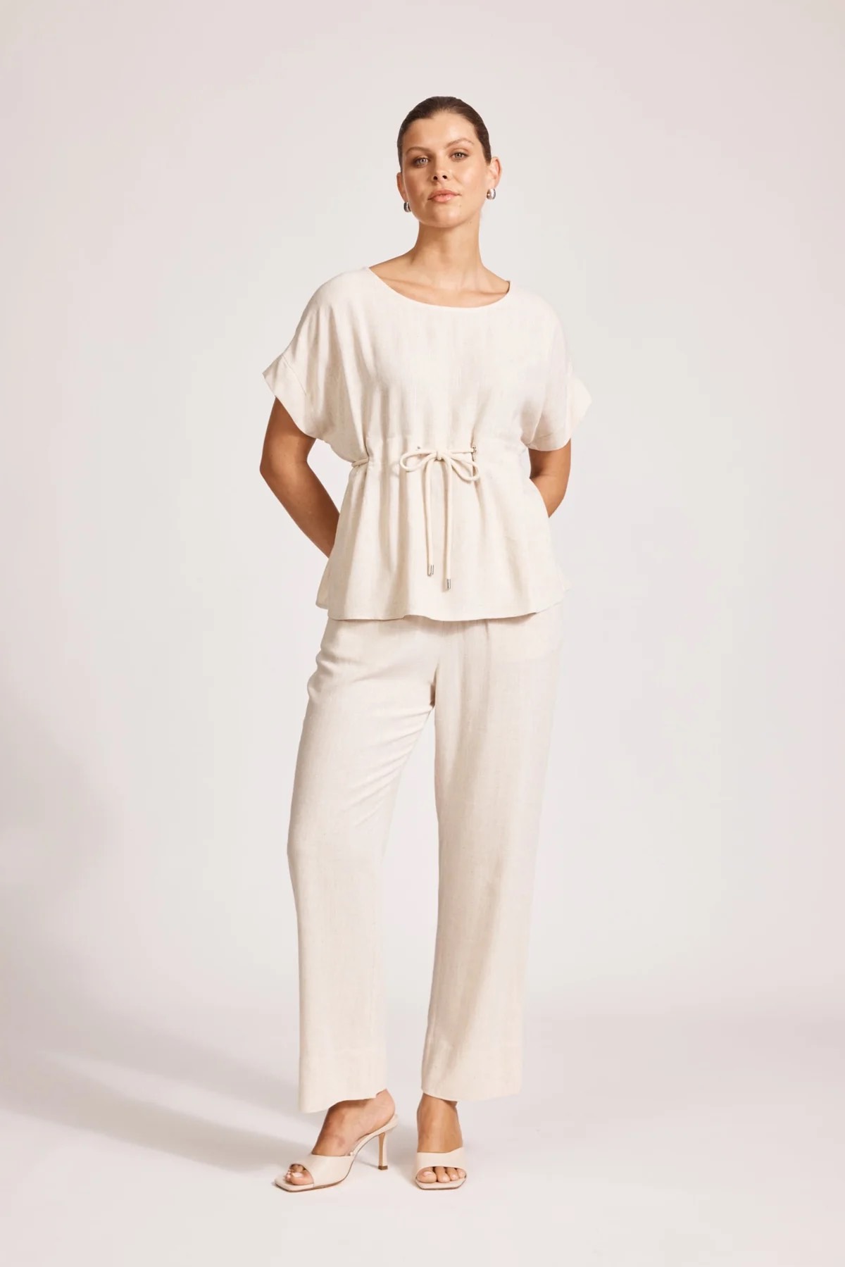 A feminine summer top with waist definition. Made from a textured linen-cotton blend. Features a round neckline and a self-coloured rope threaded through the waist for a flattering cinched silhouette.