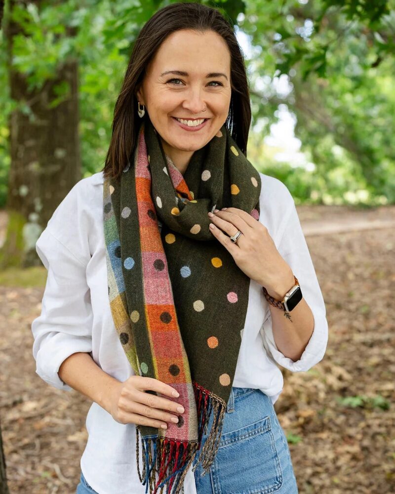 Add a fun yet effortless touch to your winter wardrobe with the Spotty Dotty in Olive Green scarf. Featuring a soft olive green base with muted polka dots in complementary tones, this cosy winter-weight scarf is perfect for everyday styling.