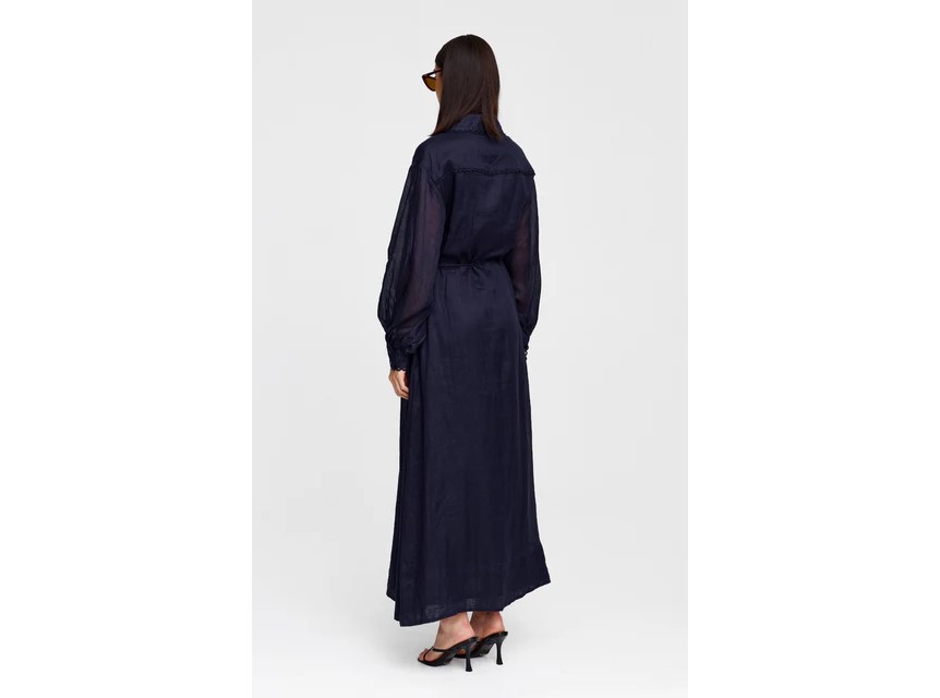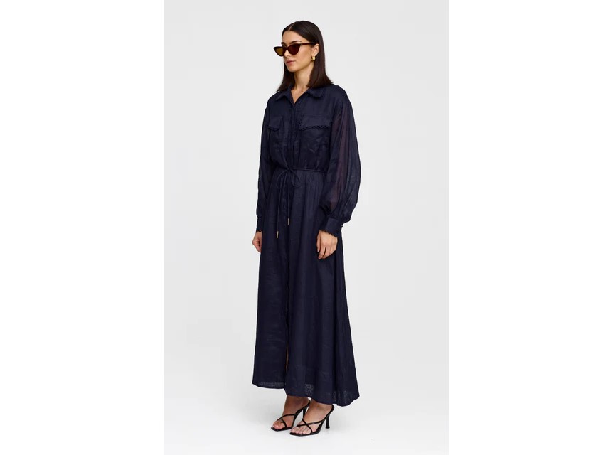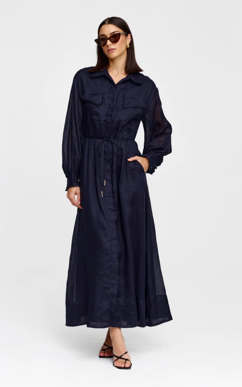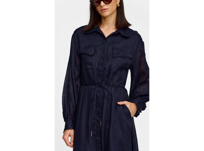 The Laurel Dress is the statement piece of the season, adorned with our new scallop trim. It features curved patch pockets, shell buttons at the cuffs and waist tie with gold toggles.