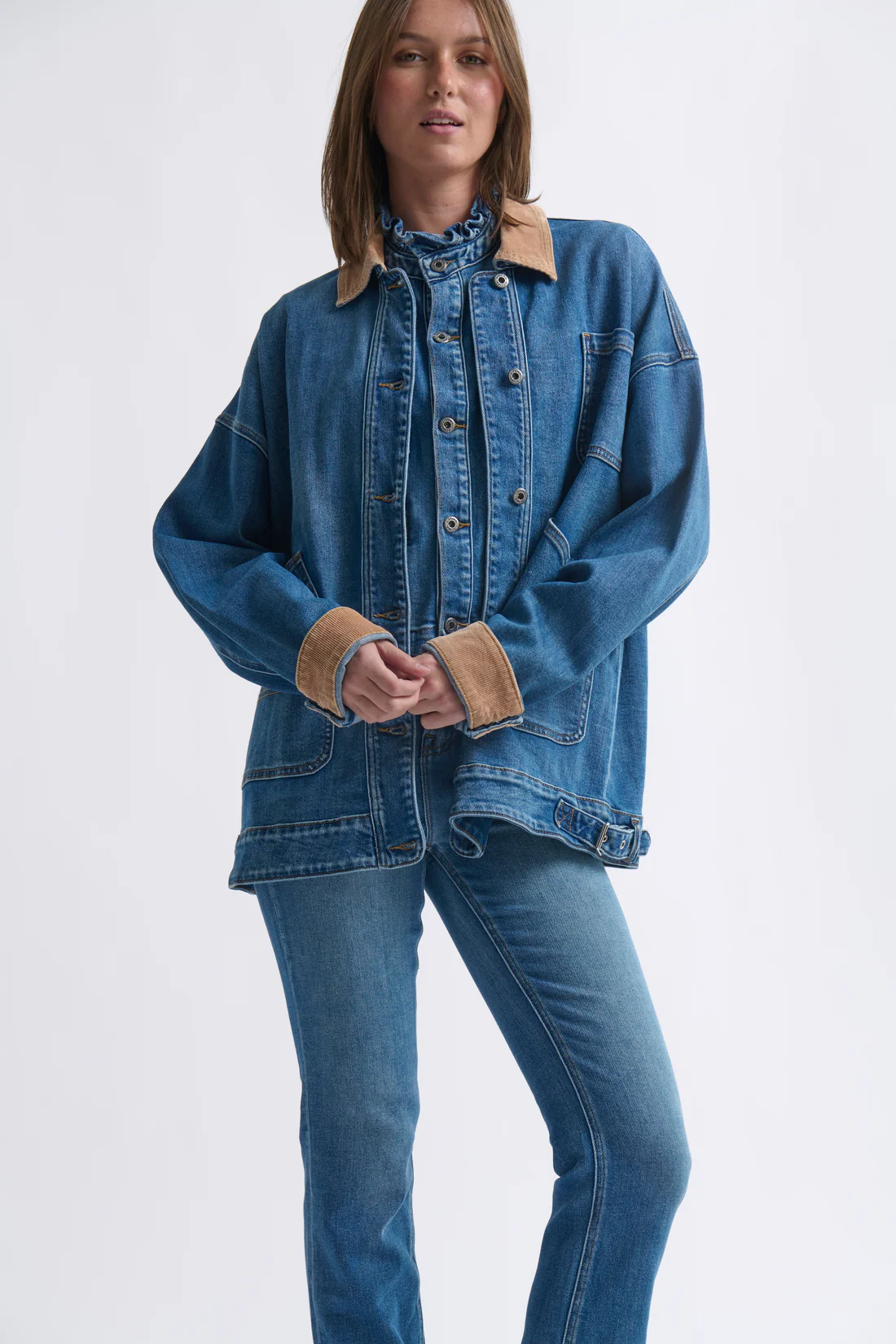 The Beth Jacket elevates the classic barn coat into a true transitional essential. Timeless design elements & boxy silhouette, utility pockets, and a cord collar and cuffs – are reimagined with Kireina’s signature touch in soft, washed denim and jean-style metal buttons. Practical by nature yet polished in execution, the Beth Jacket delivers an effortless, no-fuss aesthetic that feels both unpretentious and refined.