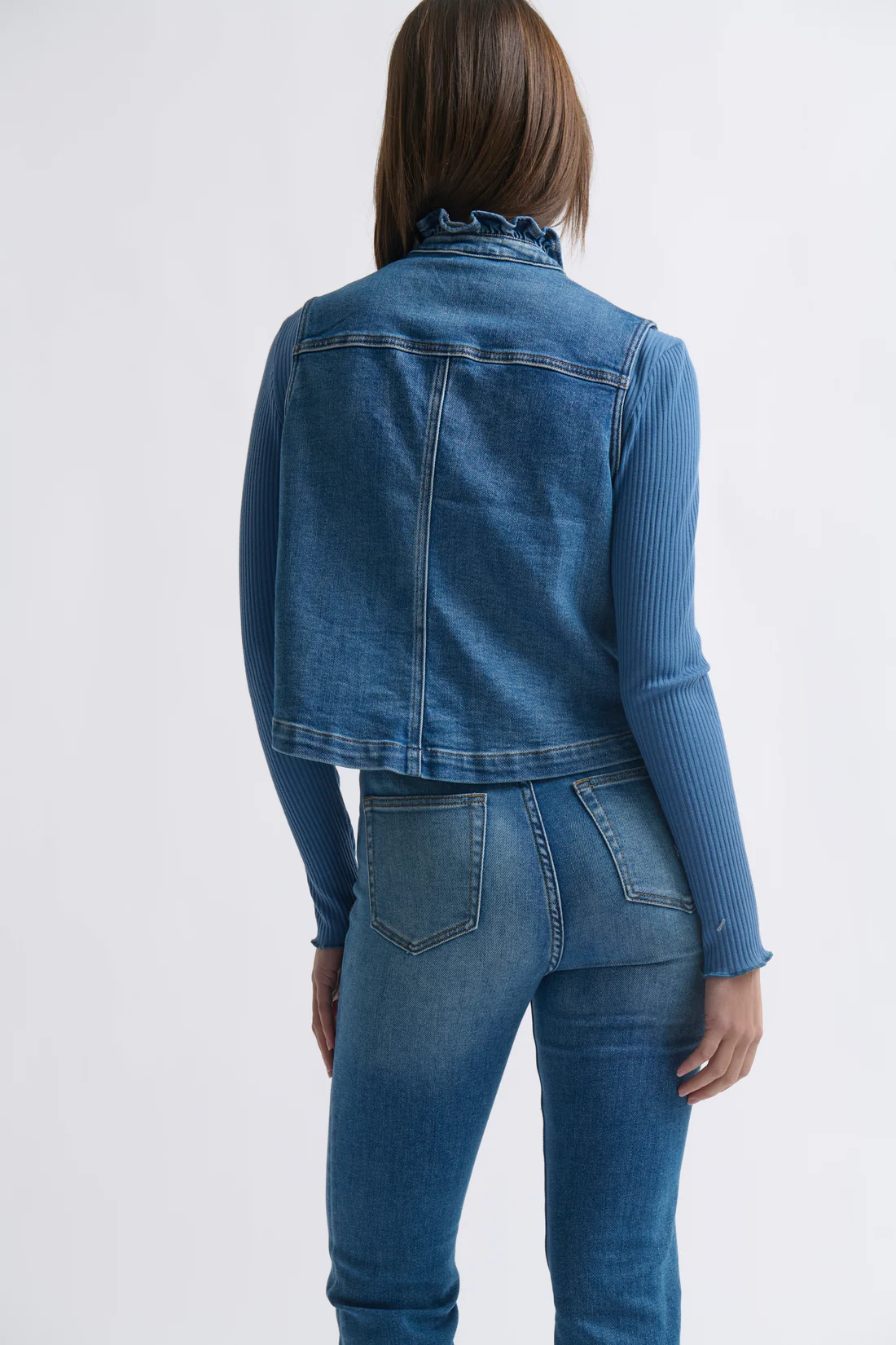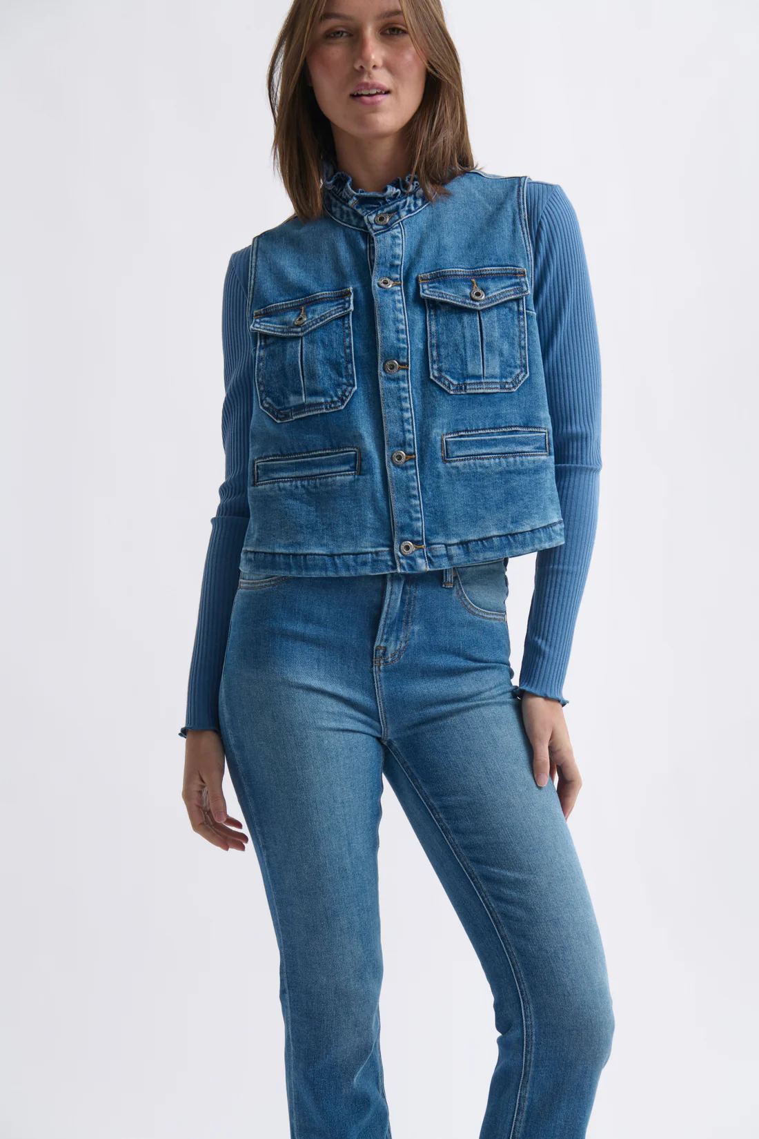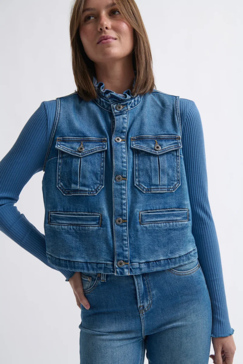 Proof that the right separate can be the finishing touch your outfit’s been waiting for, the Erica Vest blends ease with elevated detail. A softly ruffled collar, inverted pleat patch pocket with flap, and refined welt pockets bring texture and interest – all crafted in our signature soft denim. Style it with your favourite jeans and a denim shirt for a confident triple-denim moment, or layer it over a crisp white tee for a clean, classic silhouette that feels effortlessly put together.