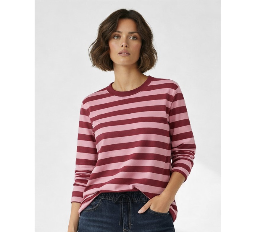 The Rose Long Sleeve Tee is crafted from jersey cotton featuring rose & burgundy stripe. This piece has a relaxed, oversized fit, long sleeves and curved neckline.