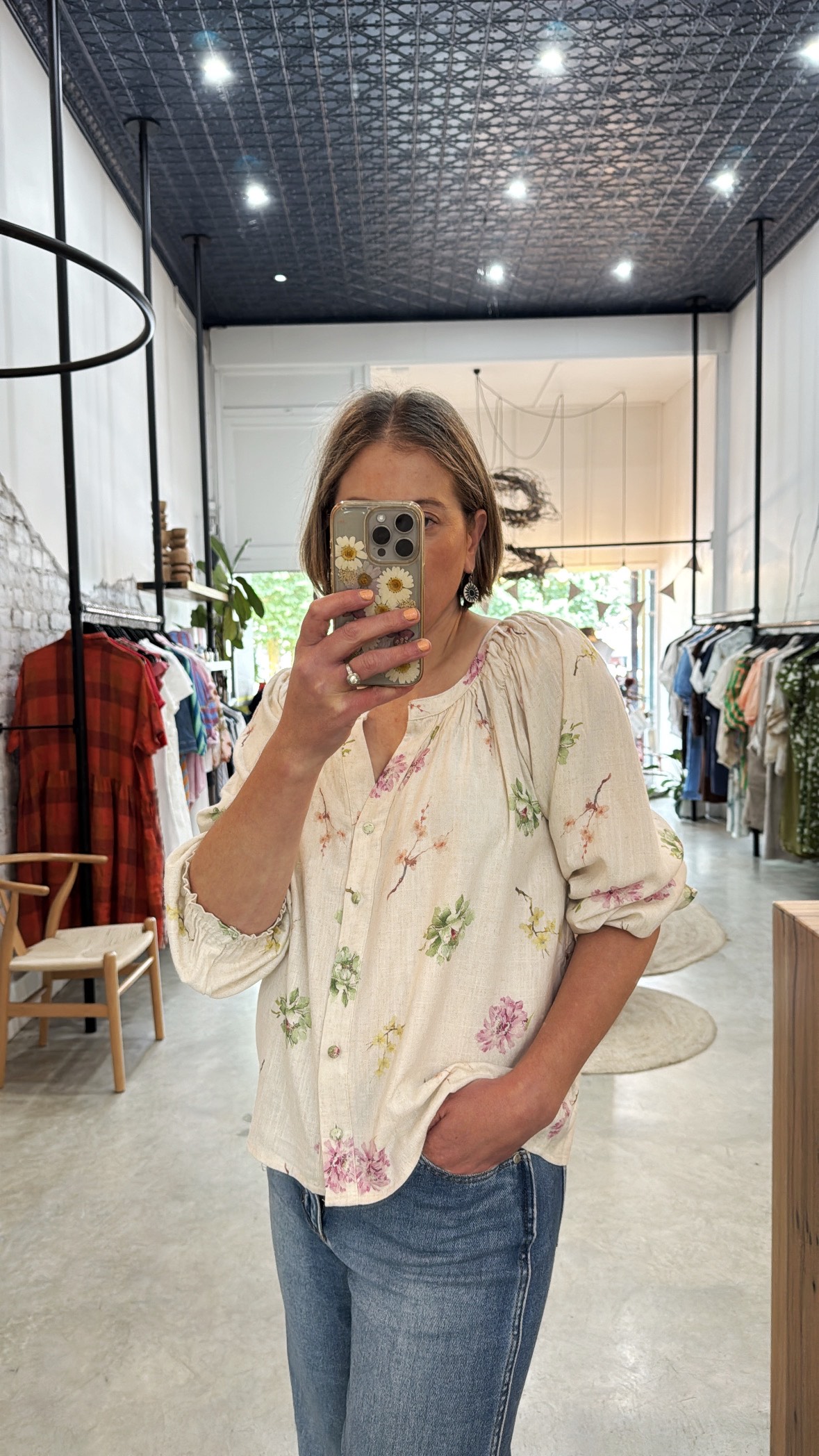 A relaxed, feminine blouse, featuring a delicate floral print on a natural base.with a gathered neckline, button up front and elasticated sleeves.