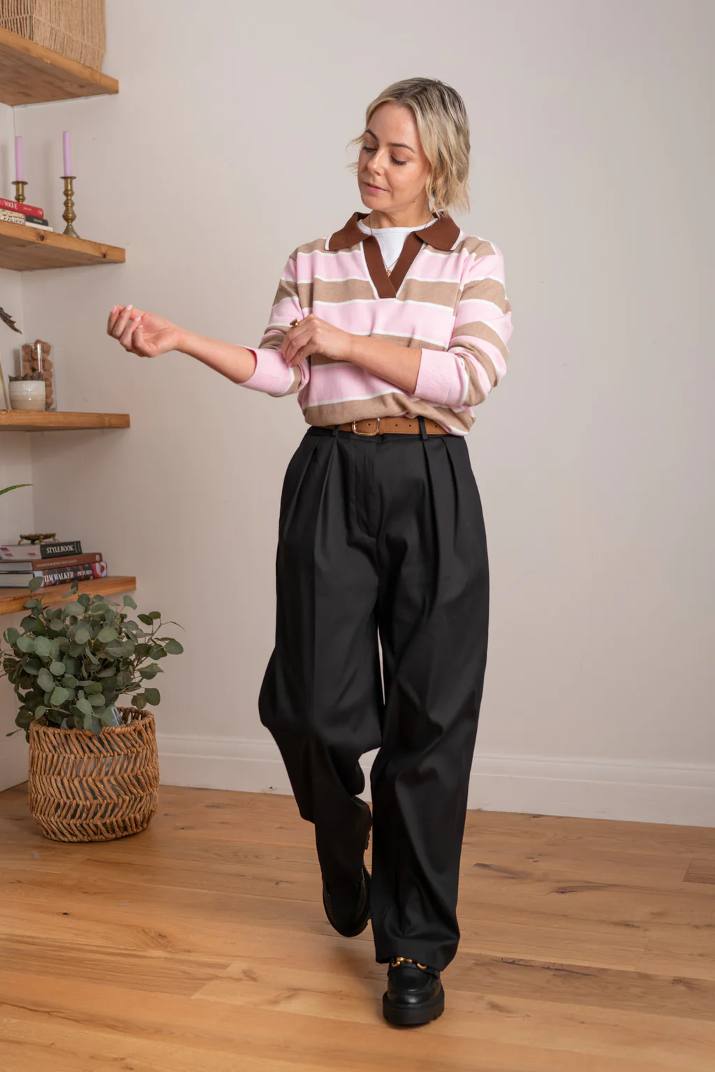 A lightweight, fine-gauge knit featuring a playful stripe design. Finished with a ribbed collar accented with white tipping, and ribbed cuffs and hem, it includes a small side split for ease and comfort—perfect for tucking or layering.