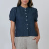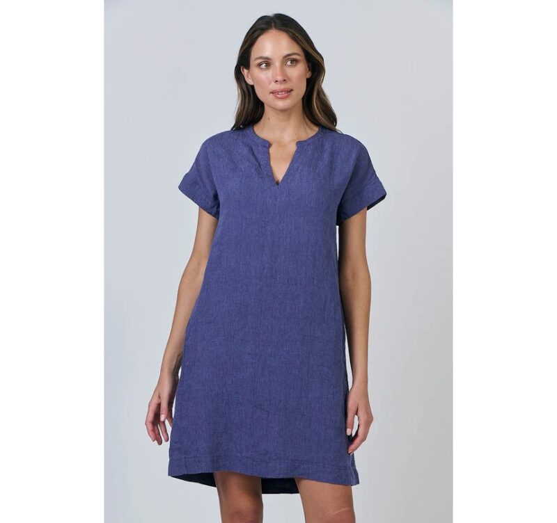 Beautiful blue short sleeve a-line dress with v-neck and back yoke detail. 100% linen