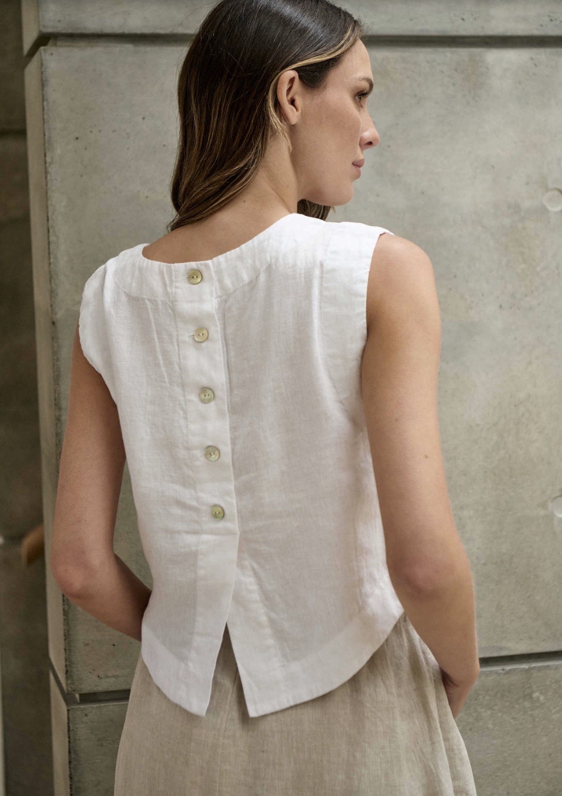 Made from 100% linen, the Naturals by O & J Linen Singlet Top is a cool classy sleeveless hip length back button top featuring a sleeveless design, round neckline, and back button details, it offers an effortless, flowing look. The loose fit pairs perfectly with skirts or high-waisted pants for a laid-back, easygoing vibe that feels as good as it looks.