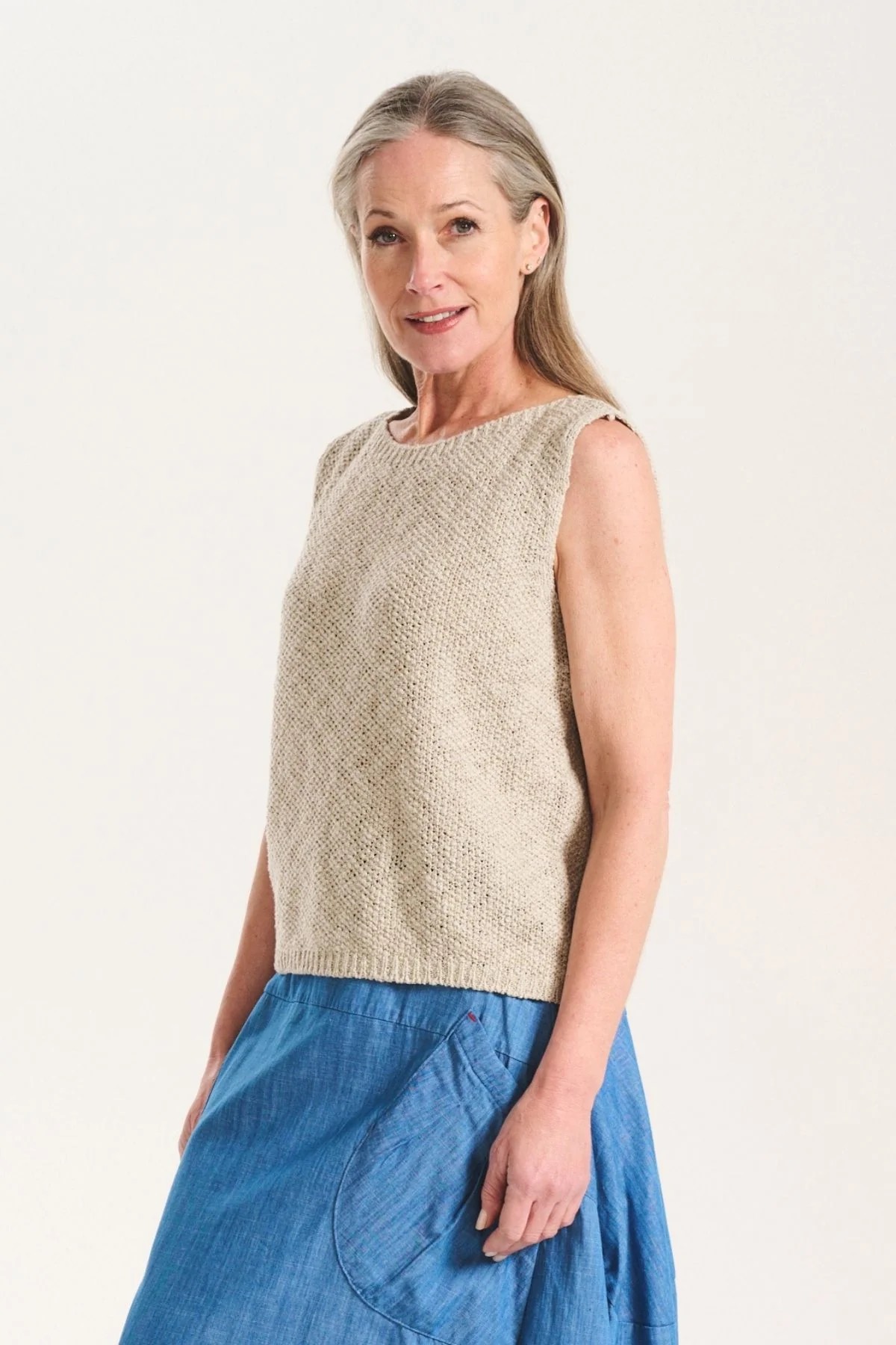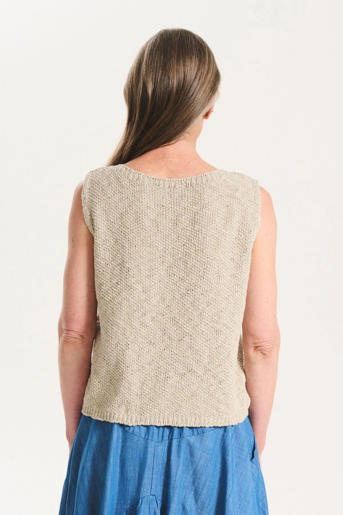 The Muse knitted vest in 100% soft cotton features a sleeveless, relaxed fit with fine-knit texture and ribbed trims—lightweight, versatile, and effortlessly elegant for layering or wearing solo.