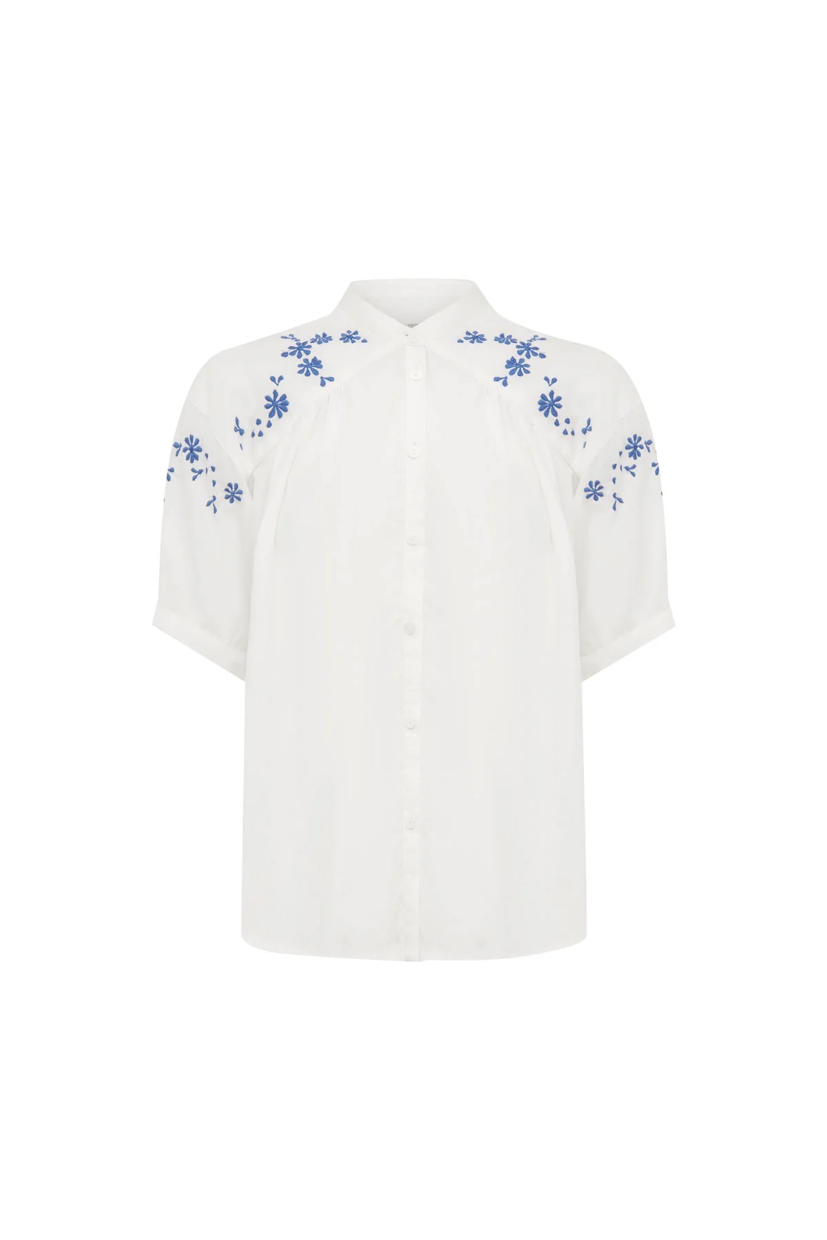 A lightweight cotton voile blouse featuring cobalt Étoile embroidery, a mandarin collar and softly gathered billow sleeves. Fresh and elevated, it offers a relaxed, true-to-size silhouette with a beautifully refined feel.
