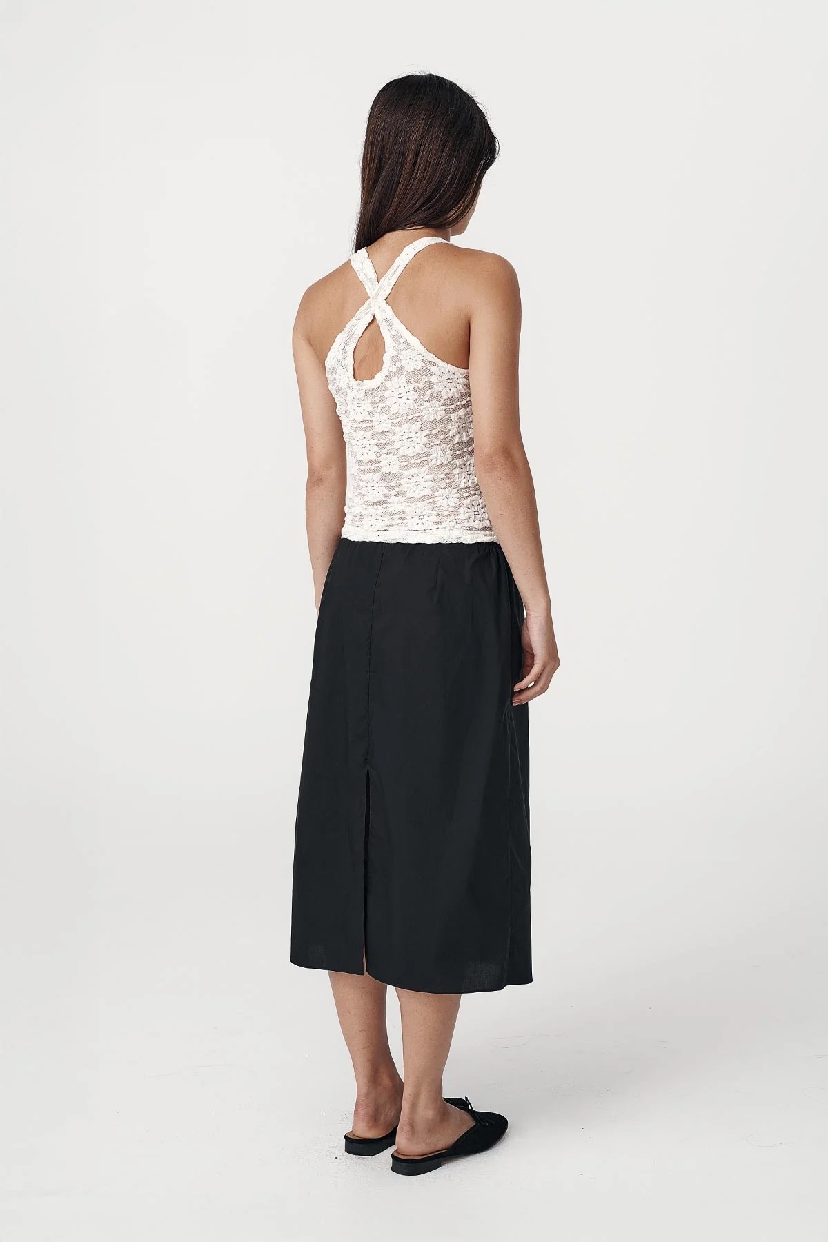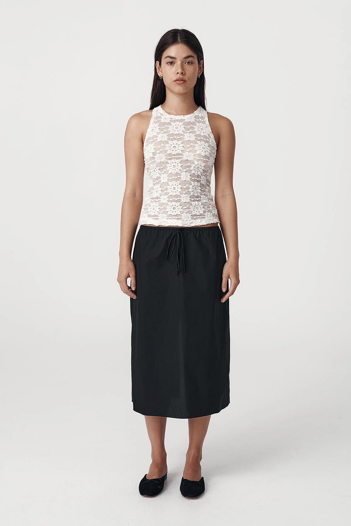 A straight poplin midi skirt with a clean drawstring waist and subtle back split. Minimal and elongating, it brings a refined simplicity to clean, modern styling.