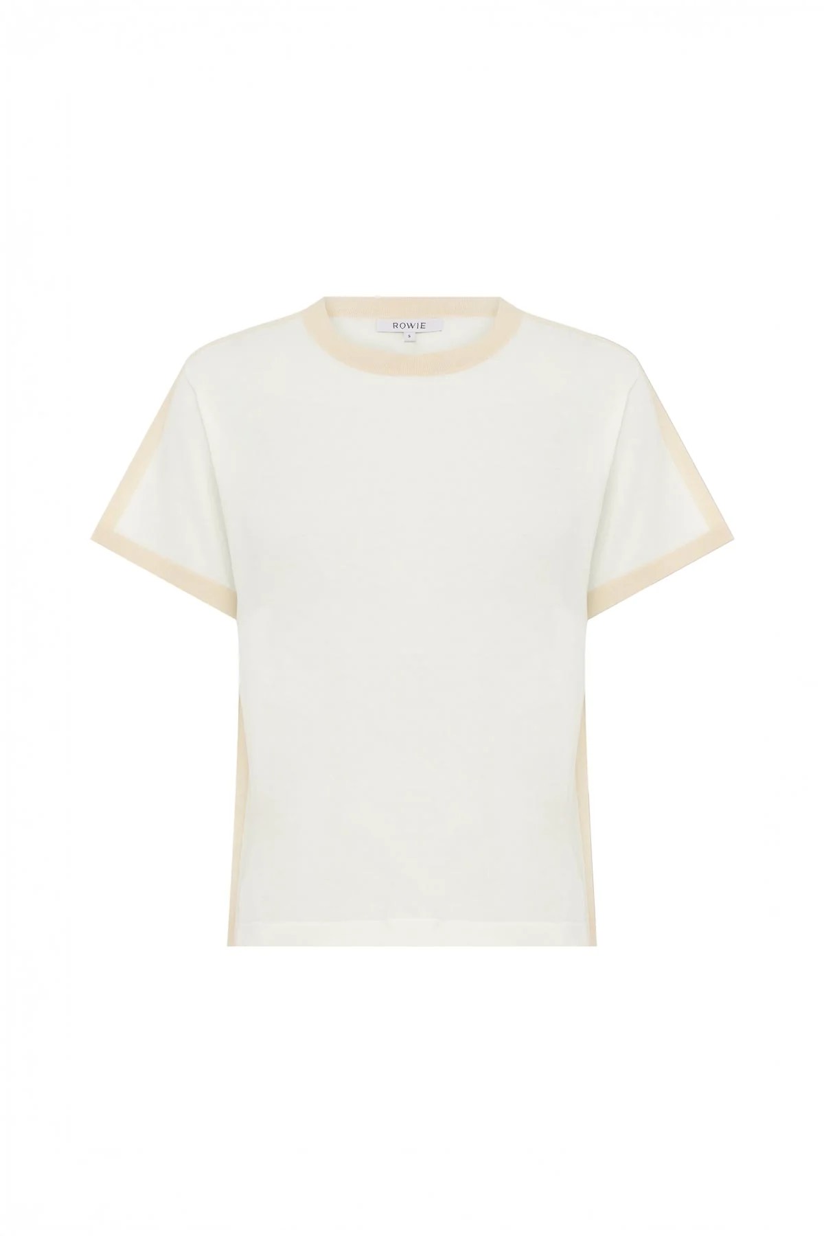 A fresh take on everyday knitwear with a subtle graphic edge. The Rania Tee in Oat Milk is a crew-neck cut with contrast trims and an easy relaxed fit. Made from 100% Superfine Cotton Zero Waste Knit