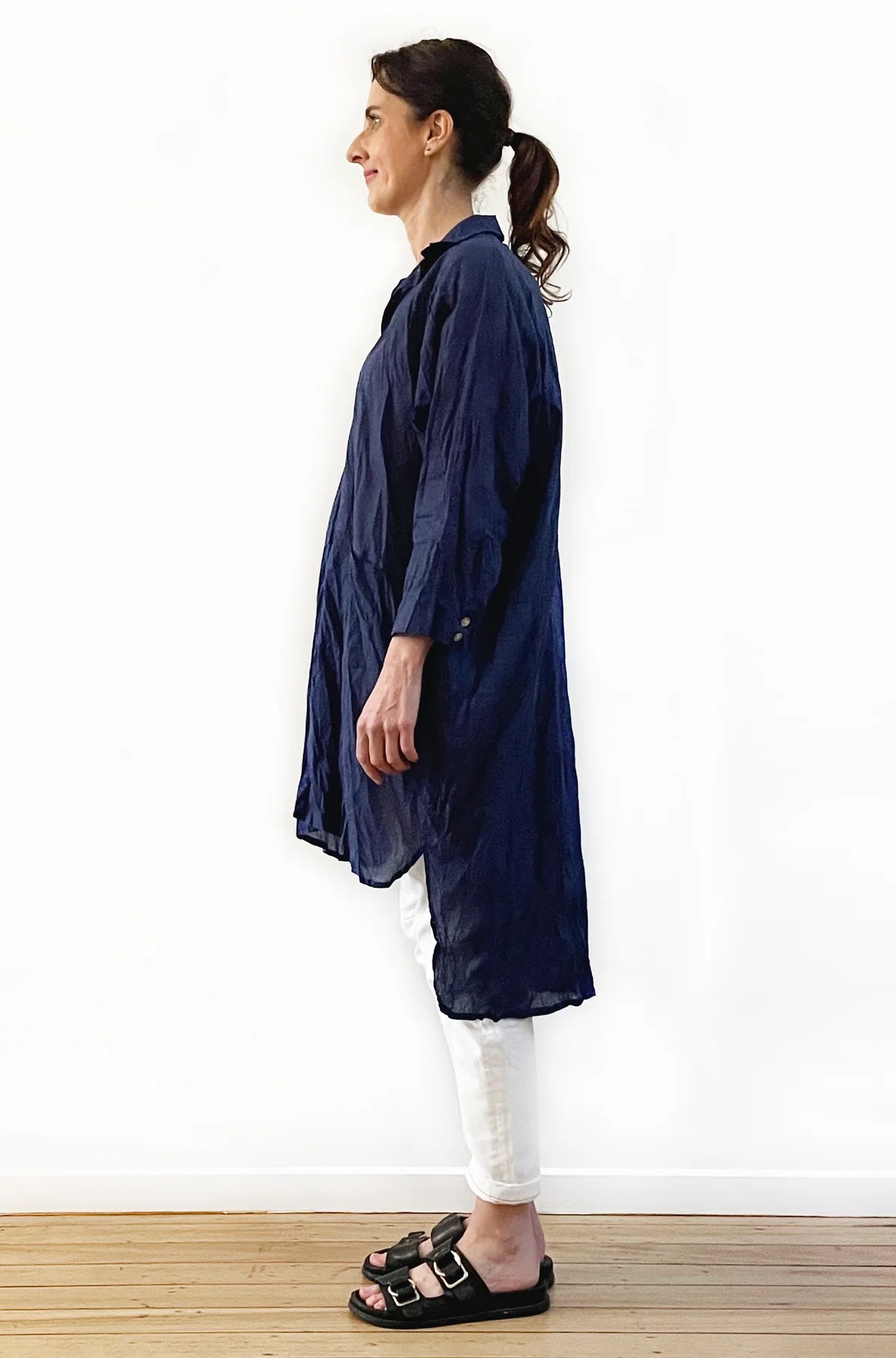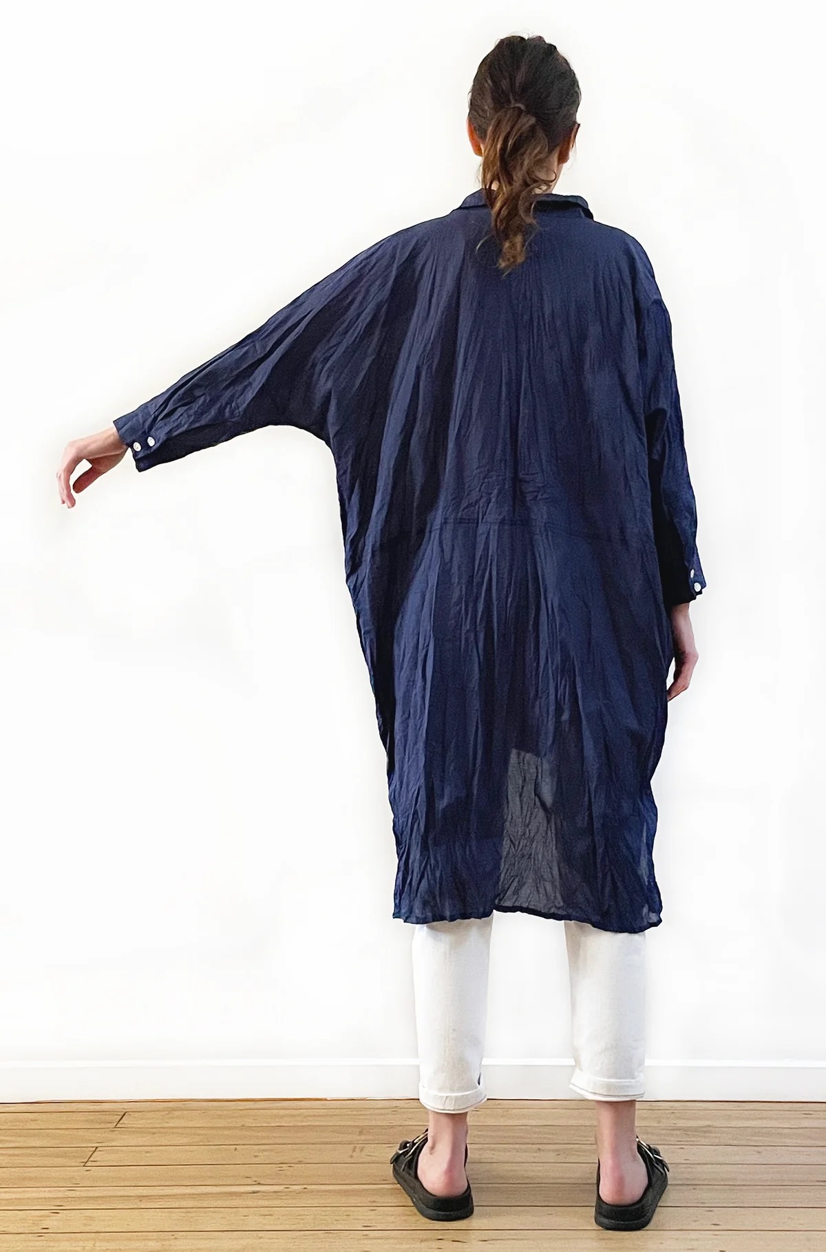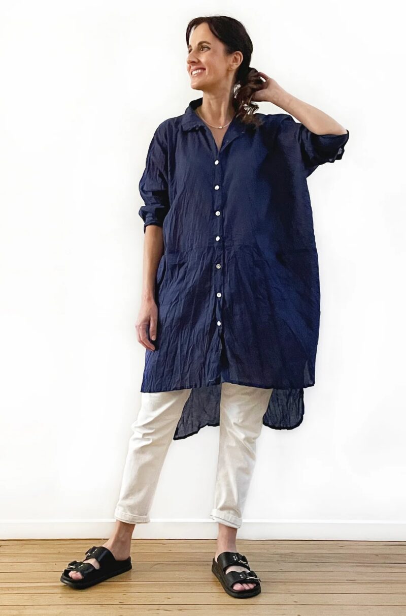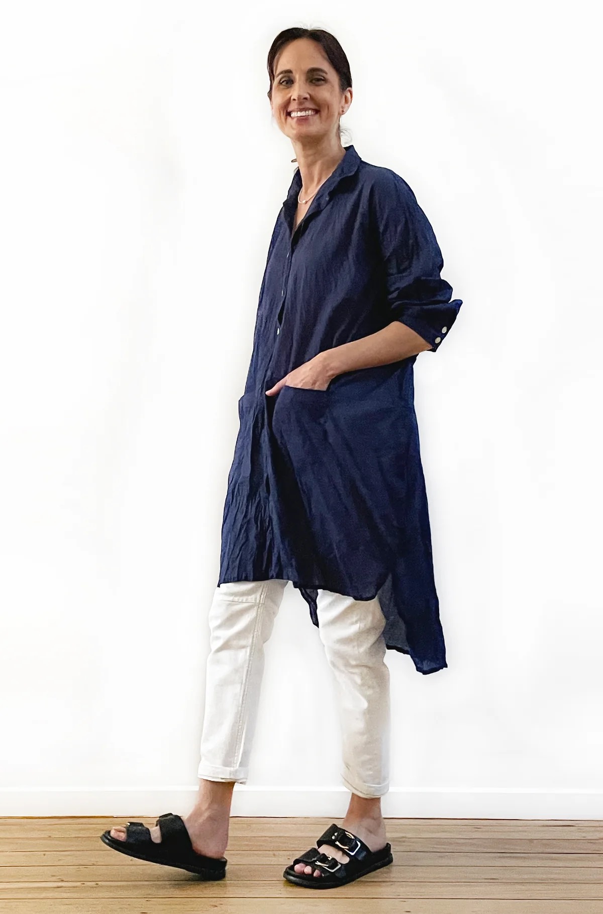 An oversized fitting button through longline shirt made from 100% cotton voile with twisted crinkle finish and featuring a shirt collar, slim fitting sleeves with buttoned cuffs, front patch pockets, a curved shirt tail hem and is finished with natural shell buttons. Twisting for storage, makes it the perfect piece for travel, as a beach cover up or to wear everyday over jeans or linen pants.