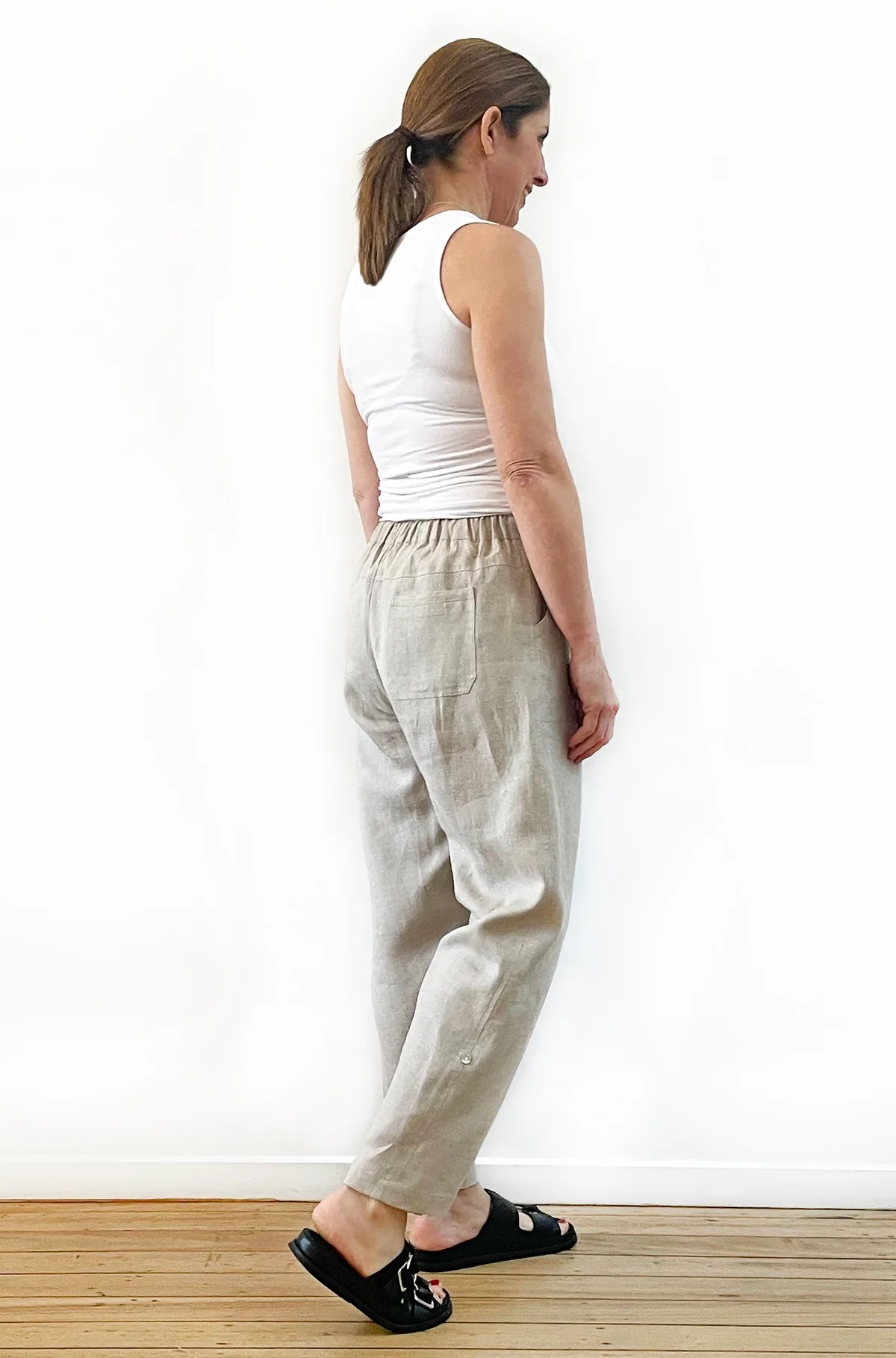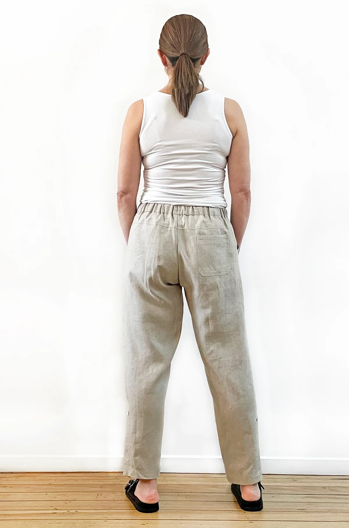 An easy fitting, full length tapered leg pant with ‘roll up’ tabs at side hem and featuring back yoke detail, front pockets, back patch pocket and a fully elasticated waist with self tie. A versatile addition to your summer wardrobe and great back with a linen shirt or your favourite white tee.