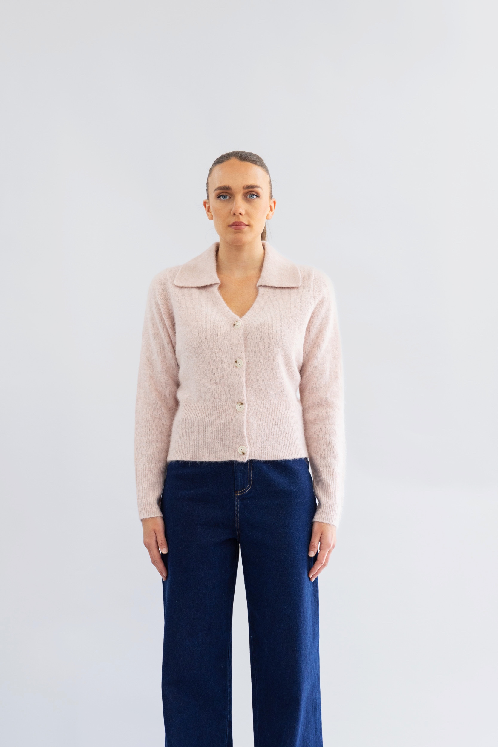 Soft, feminine and effortlessly chic, the Collared Cardi in Baby Pink adds a touch of cosy elegance to everyday dressing. Crafted from a blen of alpaca and merino, this lightweight knit with a beautifully soft texture is an easy layer this cooler months. Perfect styled with denim or tailored pieces, it brings warmth, softness, and a subtle statement to your seasonal wardrobe.
